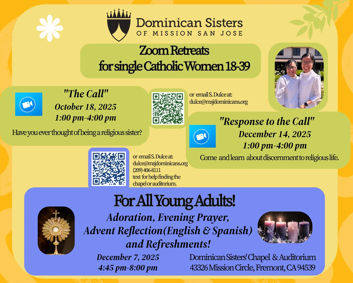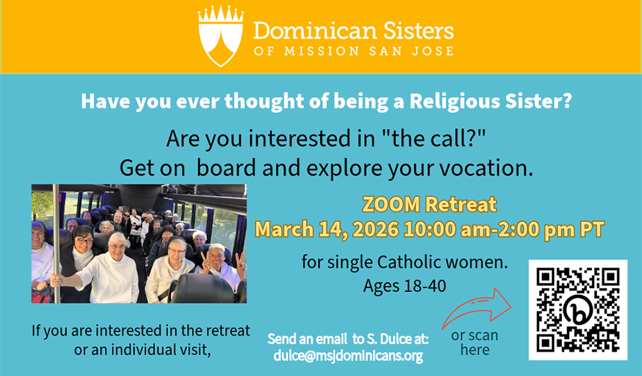 We, the Dominican Sisters of Mission San Jose, the Congregation of the Queen of the Holy Rosary, are called to live and proclaim Jesus Christ through evangelizing, preaching, educating, and promoting justice and peace.